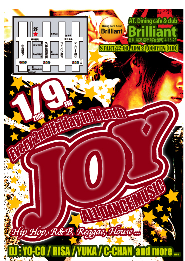 JOY 〜ALL DANCE MUSIC〜 @Brilliant 鍛冶屋町4ー15ー2F DJ YOーCO YUKA RISA CーCHAN START22:00 ADM1000YEN/1D 女の子四人によるオールジャンルイベント! みんな遊びにきてね! 只今ゲストさんを募集してます。 どしどし連絡ください