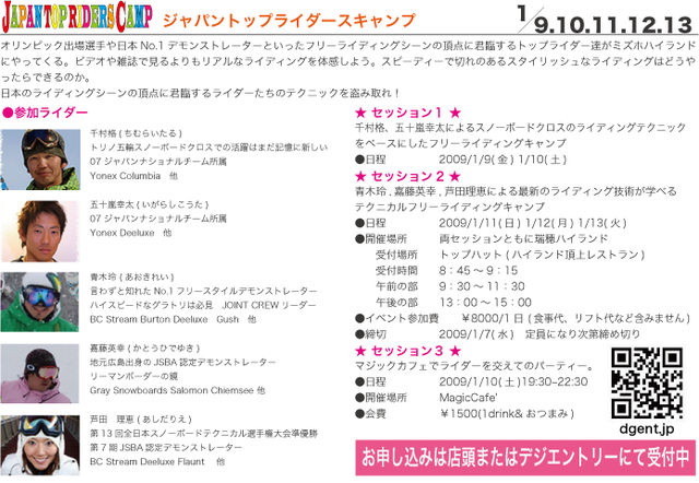 管理人様こんにちわ。突然の告知失礼します。 オリンピック出場選手や日本No.1デモンストレーターといったフリーライディングシーンの頂点に君臨するプロフェッショナルライダー達がミズホハイランドにやってきます。 2009初っぱなからなかり熱いキャンプになること間違いなし!! 滑走系を追求している人もストリートスタイルな人も必見です。Snowboardを仕事にしている方なだけあって超一流。滑走だけにとどまらず、いろんな意味で勉強になると思いますよ。 また新しい事に気付いたり、目標も見つかるかもしれないですね。 是非チ
