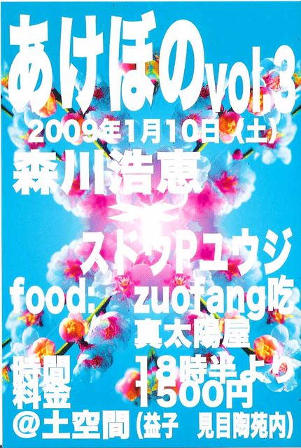 箏奏者ー森川浩恵さんが栃木県益子で演奏をします。 興味のある方、お近くのかた、ぜひ遊びにきて下さい。 『あけぼの』vol.3 2009年1月10日(土) 18時半より 1500円 @土空間(益子ー城内坂ー見目陶苑内) ★live 森川浩恵(箏)×スドウPユウジ(ライブペイント) ★food zuofang 吃 真太陽屋 動画もぜひ、ごらんあれ! 森川浩恵 LIKE A BIRD 正月気分がそろそろ抜けそうな時ですが、箏の音色でback to the正月 和服の方には、500円割引もついてます。 もちろん、今回もzuofang 吃が出店して