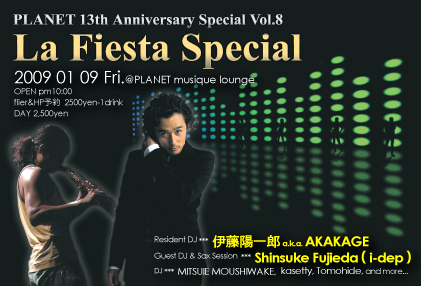 ★1/9(金) PLANET 13th Anniversary Special Vol.8 [ La Fiesta Special] HOUSEMUSIC & HAPPY DANCE MUSICS OPEN pm10:00 flier&HP予約 2,500yen-1drink / 当日 2,500yen Resident DJ : 伊藤陽一郎 a.k.a. AKAKAGE < http://akakage.syncl.jp/ > Guest DJ & Sax Session : Shinsuke Fujieda (i-dep) < http://www.i-dep.jp > DJ : kasetty, Tomohide 愛の4つ打ちDJ 伊藤陽一郎のレギュラーイベント 「 La Fiesta 」。 ほぼレギュラーDJ化しつつある i-dep のフロントマンとしてエネルギッシュ なプレイでファンを魅了する Sax Player