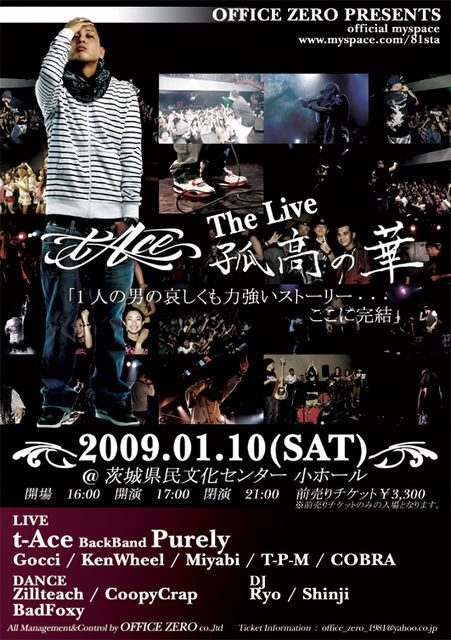 OFFICE ZERO PRESENTS 2009.01.10(sat) t-Ace The live “孤高の華” @茨城県民文化センター 大ホ ール “2年間でのlive動員数3,360人...これまでのt-Aceの結晶” 16時 開場 17時 開演 21時 閉演 16:00~ DJ SHINJI 17:00~ 17:15 DANCE SHOWCASE COOPY CRAP,BAD FOXY,ZILLTEACH 17:15~17:35 MIYABI 17:35~17:50 COBRA 17:50~18:05 T-P-M 18:05~18:25 KENWHEEL&DJ TOMIKEN 18:25~18:40 GOCCI&DJ MASH 18:40~19:30 BREAK TIME DJ RYO 19:30~21:00 t-Ace The Backband PURELY www.myspace.com/81sta(試聴、b
