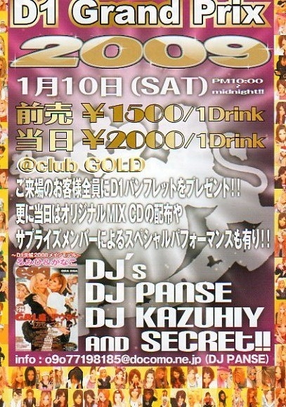 D-1 GRANDPRIX 2009 〜TRANCE&ALL MIX〜 22:00 OPEN 全国最大級サークルイベント! -GUEST MODEL- 細川宏美/川端かなこ DJ.PANCE/DJ.KAZUHIY &SECRET DJ!! ご来場のお客様全員にD-1パンフレットをプレゼント! MIX CD配布有り! produced by DJ.PANCE special thanks ・avex trax DAY \2000/1D ADM \1500/1D