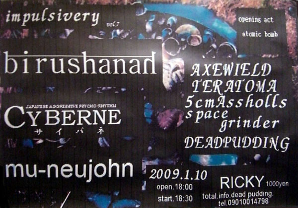 ■01/10(SAT)@高松 RICKY DEAD PUDDING presents… “Impulsivery,vol.7” bands⇒ ◆毘盧釈那 –birushanah- 【from 大阪】 ◆mu-neujohn 【from 大阪】 ◆CYBERNE 【from 大阪】 ◆SPACEGRINDER 【from 松山】 ◆AXEWIELD (ex,EFFIGY) ◆TERATOMA ◆5cm ASSHOLLES ◆DEAD PUDDING 新年早々のImpulsivery第7弾は新春ならではの豪華競演!!! *世界を股にかけ活動するビルシャナはアメリカ、オーストラリア、ヨーロッパと数回に渡るツアーをこなし、彼ら独特のエクスペリメンタル和製サウンドを武