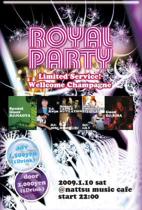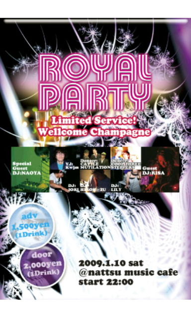 ☆ROYAL PARTY☆ 開催日:2009・1・10sat 場所:@nattsu music cafe 高松市古馬場町13-16 エルパセオ.bld 3F tel:087-822-2776 時間:start 22:00 料金:adv(前売り)1500yen+1d door(当日)2000yen+1d 記念すべき第一回Special Guest DJ:NAOYA氏を迎えて開催! Special Guest DJ:NAOYA GUEST DJ:RISA DJ:HIROK@ZU DJ:庵(IORI) DJ:LILY VJ:Kwjm Dancers COOL THREE STEPPERS CATTLE MUTILATION 以上のメンバーを迎えての開催となっております もれなく、来場者全員にWelcomeシャンパンをサ