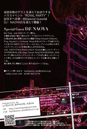 これから香川のCLUBシーンに歴史として刻んでいくであろうHOUSE PARTY LIQUID_SPACE.ASIAが提供するpartyが遂に始動!! 中四国で頑張っているアーティストを中心にゲストととして呼びそれぞれのローカルを熱く盛り上げていこうというparty それが、 ☆ROYAL PARTY☆ 開催日:2009・1・10sat 場所:@nattsu music cafe 高松市古馬場町13-16 エルパセオ.bld 3F tel:087-822-2776 時間:start 22:00 料金:adv(前売り)1500yen+1d door(当日)2000yen+1d 記念すべき第一回Special Guest DJ:NAOYA氏を迎えて開