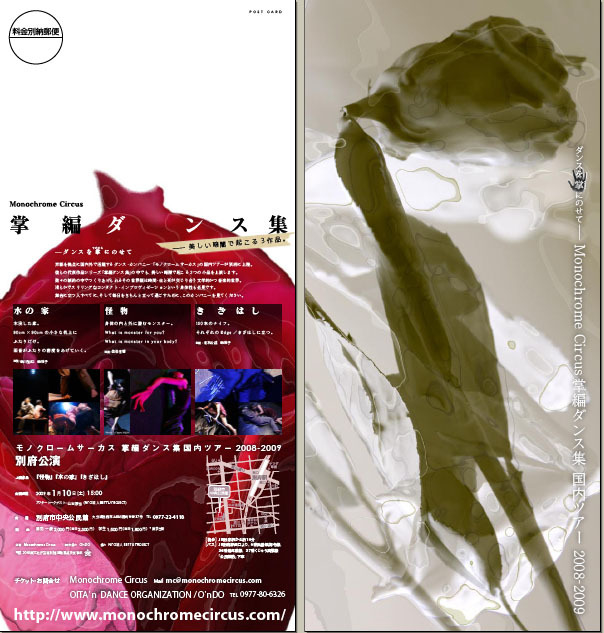 管理人様、告知失礼いたします。 *************** 「ダンスを掌にのせて−−−」 京都を拠点に国際的に活躍するダンスカンパニー モノクロームサーカス。 その代表作品シリーズ『掌編ダンス集』が、国内3カ所をめぐる ツアーの最終地として別府にやってきます! このシリーズは、 川端康成の『掌(たなごころ)の小説』に想を得てはじまり、 たった5分のナンセンスなソロから、25分の濃密なデュエット、 シュールなカルテット作品まで、時間やスケールの枠に とらわれない7作品が自由な単位で製作されてきまし