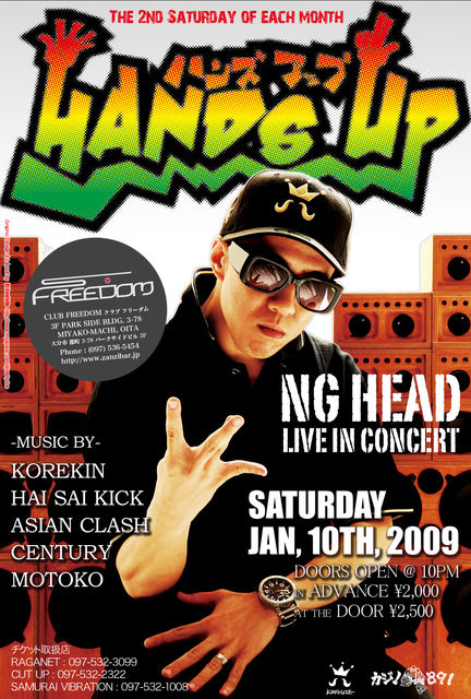 HANDS UP 2009年1月10日 @FREEDOM start 22:00 adv 2000円 day 2500円 SPECIAL GUST : NG HEAD music by : KOREKIN .HAI SAI KICK .ASIANCLUSH CENTURY .MOTOKO チケット取扱 RAGANET 097-532-3099 CUT UP 097-532-2322 SAMURAI VIBRATION 097-532-1008 RAGA LIFE 080-3956-1014
