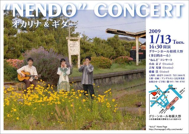 待ちに待ったギターとオカリナのグループ”ねんど”のコンサートのお知らせです 新しい年の初めにふさわしくオカリナやギター以外にも色々な楽器が・・ 着物姿で篠笛 又ある時は不思議な楽器が・・・ “ねんど”コンサート(神奈川県相模原市) 2009年1月13日(火)14:30〜 出 演;小山京子、吉塚光雄(オカリナ)齋藤 浩(ギター) 場 所;グリーンホール相模大野(多目的ホール)小田急線相模大野駅北口より徒歩4分 入 場 料;2.500円(前売り) 2.800円(当日) お問い合