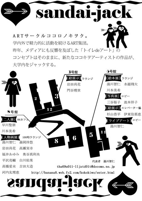 学内外で精力的に活動を続けるART集団ココロノキヲク。 昨年メディアにも反響を及ぼした「トイレdeアート」 そのコンセプトはそのままに、新たなココキヲアーティストの作品が、 大学内をジャックする。 8号館 [二人展] 84カフェにて 早川聖朋 川本美希 [人物画展] 100均ラウンジにて 湯川智仁 森岡祥悠 岩田尚花 高瀬実幸 福井あゆみ 奥谷真利央 平沢亮輔 白川佑果 高橋愛未 吉田大造 河内友理恵 3号館 [絵展示] 3号館ラウンジにて 岩田尚花 門谷理世 5号館 [絵本展] 5号館ラウンジにて 湯