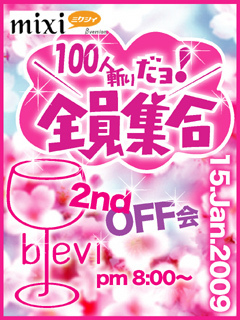 明けましておめでとうございます! 今年もおめでとうございます。 早いですね〜2009年も残り360日を切ってしまいました。 忘年会をする前に、メンバー100人超、また新年会として、 オフ会を開催しま〜っス! ★★★1月15日 木曜日 8時〜(雨天決行)★★★ 前回と同じように、貸切りませんので当日参加OKです!! 1杯だけの参加、5本の参加、皆さまのご都合でご参加ください。 beviに来た事がないア〜タ!!! これを機会にどうぞ!! メンバーじゃなくてもOKなので、お友達もお誘い下さいネ ! それでは皆さまで酔い時間を過