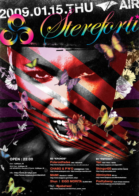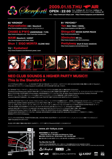 管理人様、告知失礼致します。 1/15、代官山AIRにて行われるイベントのお誘いです。 NEO CLUB SOUNDS & HIGHER PARTY MUSIC!!! 09/01/15/Thu Stereforti Venue:AIR Open:22:00 Door:3000(1d) w/f2500(1d) AIR Members & Stereforti Friends2500(1d) info: http://www.air-tokyo.com http://www.myspace.com/stereforti B2"KRONOS": Poraloidfades (24K / Stereforti) http://www.myspace.com/p_o_l_a_r_o_i_d_f_a_d_e_s CHABO & P'N'O (UNDERGRAM / T.P.E.) http://www.undergram.com http://www.tpe-