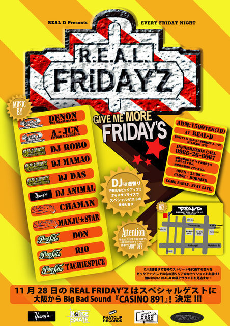 毎週金曜日に開催中の【REAL-FRIDAYZ】第3週目!! DENON BIRTHDAY BASHを開催です! 宮崎CLUBシーンの第一人者として常に牽引してきたDENON THE REMIXMASTERをメインアクトに向かえ、BIRTHDAY BASHを兼ねて盛大に開催決定! DJ MAMAO、A-JUN、YSKのオリジナルメンバーに加えPACE SETTAもお祝いに駆けつけ、オーディエンスを巻き込むVIBES独自のスタイルでエンターテインメントな夜を演出する。 イケイケなだけのメインストリームとも辛気臭いヘッズ受けとも違い、確かなドープネスと艶のあるパーティー・ヴァイブスを併せ持ったアーティス