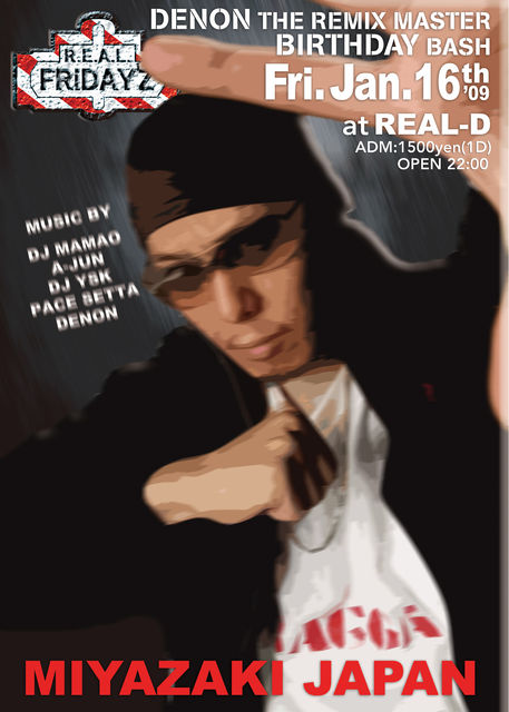 明日1月16日は! 毎週金曜日に開催中の【REAL-FRIDAYZ】第3週目!! DENON BIRTHDAY BASHを開催です! 宮崎CLUBシーンの第一人者として常に牽引してきたDENON THE REMIXMASTERをメインアクトに向かえ、BIRTHDAY BASHを兼ねて盛大に開催決定! DJ MAMAO、A-JUN、YSKのオリジナルメンバーに加えPACE SETTAもお祝いに駆けつけ、オーディエンスを巻き込むVIBES独自のスタイルでエンターテインメントな夜を演出する。 イケイケなだけのメインストリームとも辛気臭いヘッズ受けとも違い、確かなドープネスと艶のあるパーティー・ヴァイブスを