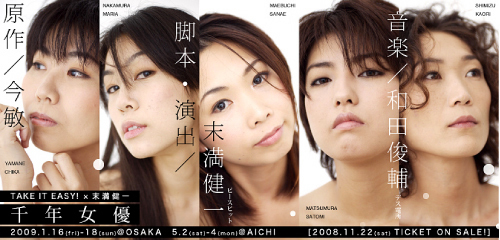 映画世界と現実を行き交いながら、時を超えて語られるラブ・ストーリー「千年女優」を、神戸の演劇ユニット・TAKE IT EASY! が初の舞台化。脚本・演出にピースピットの末満健一、音楽にデス電所の和田俊輔を迎え、5 人の女優たちが疾走するアニメ世界をリアルに立ち上がらせる!
