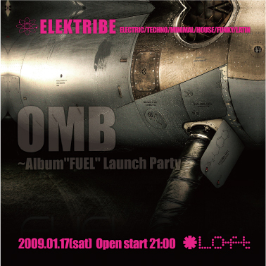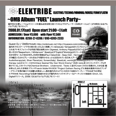 ELEK TRIBE 【OMB AlbumFUELリリースパーティー!】 2009年1月17日 Open start 21:00〜 Loft@長野県上田市中央2-13-10 ADMISSION:Door¥3,000/with Flyer¥2,500 ↓Flyerをお持ちでない方も当日までにこちらへメッセージを送っていただければディスカウントできます。 http://mixi.jp/show_friend.pl?id=524468 Special Guest Dj OMB (FRAME) http://ombmusic.net http://myspace.com/ombtokyo Resident Dj’s CAKRA(天竺) KEISUKE(another wise/天竺) SEKKY(ADRENALINE) JO-JI(a