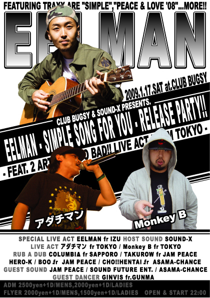 SOUND-X & CLUB BUGSY presents. EELMAN "SIMPLE SONG FOR YOU" RELEASE PARTY!! 2009.1.17.SAT @CLUB BUGSY HOST SOUND: SOUND-X SPECIAL GUEST LIVE: EELMAN GUEST LIVE fr.TOKYO: アダチマン MonkeyB RUB A DUB SHOW CASE: COLUMBIA TAKUROW fr.JAM PEACE BOO fr.JAM PEACE HERO-K(IRIE BREDREN) CHO!!HENTAI fr.ASAMA CHANCE GUEST SOUND: JAM PEACE SOUND FUTURE ENT. ASAMA CHANCE GUEST DANCER: GINVIS fr.GUNMA START:10PM / CLOSE:5AM ADM:2500yen+1D(MENS) 2000yen+1D(LADIES) W/F:2000yen+1D