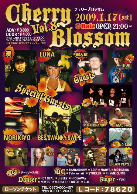 2009.1.17(SAT) Cherry Blossom Vol.8 SPECIAL GUEST LIVE!! 漢 LUNA NORIKIYO BES from SWANKY SWIPE GUEST LIVE!! 輪入道(from千葉) LIVE!! M.B.I/HORI/MAD FACE/M.H.U BRAND/NO-SIDE/千鳥/BREAST PLAYEZ/C.C.P/RYO/BANCHOHH!!/CAFE AU LAIT/ MOTO&KIN/T.O.P/SYOKKER/NAOYA/RHYME CLIMB/YUKI DANCE!! HOT GYAL/N.MG/J-SEEY/MARIA THE BITCH/G-POINTERS/CLR DJ!! SAKI/SAIN/チャピー(Raiz) @Raiz 松本市深志1-2-15 CE