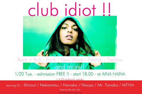 ※管理人様、告知させて下さい。 今年最初のclub idiot!!は誰も来そうにないド平日の火曜日、しかも繁華街から少しだけ離れたAINA HAINAです。 店の雰囲気最高です。 1Fでおいしいご飯を食べた後は2Fで音楽に浸るなど、好きにしてください!! AINA HAINAコミュhttp://mixi.jp/view_community.pl?id=276460 club idiot!!コミュhttp://mixi.jp/view_community.pl?id=3413209 前回同様、入場無料。 18時から24時までです。
