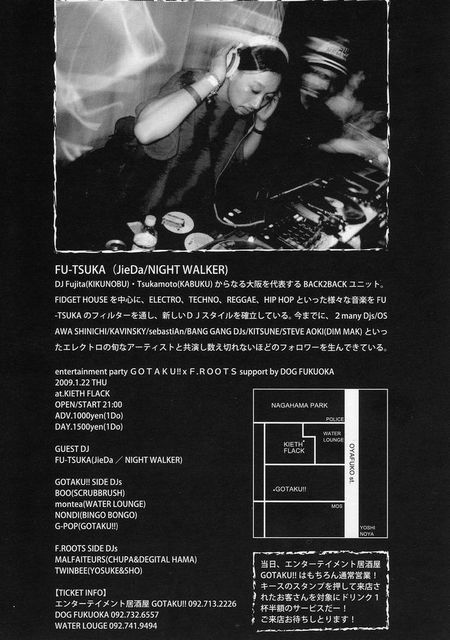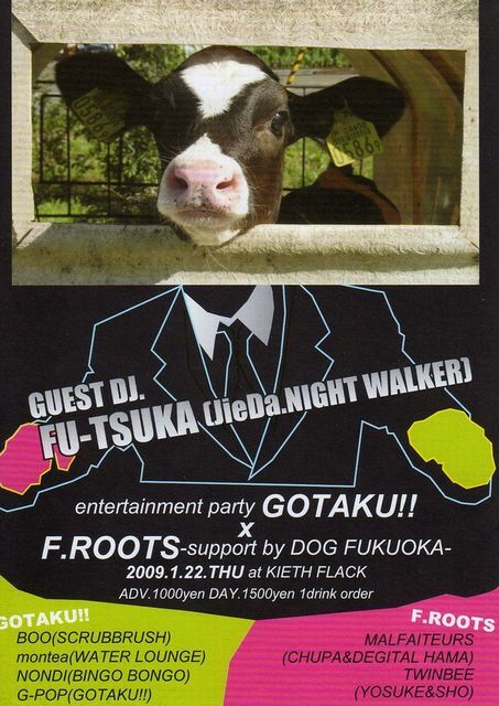 管理人様、突然の告知で大変に失礼致します。 【entertainment party GOTAKU!!×F.ROOTS-support by DOG FUKUOKA-】 2009/1/22 (THU.) @KIETH FLACK 2F OPEN 21:00 CLOSE 4:00 ADV.¥1000-(1DO) DAY.¥1500-(1DO) [GUEST DJ] FU-TSUKA (JieDa/NIGHT WALKER) [GOTAKU!!SIDE DJs] BOO (SCRUBBRUSH)/ROCK montea (WATER LOUNGE)/TECHNO NONDI (BINGO BONGO)/ALL G-POP (GOTAKU!!)/J-POP [F.ROOTS SIDE DJs] MALFAITEURS (CHUPA&DEGITAL HAMA)/ELECTRO,HOUSE TWINBEE (YOSUKE&