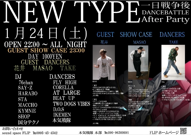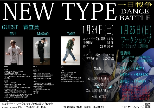 1月24/25日FLIPでダンスイベントとゲストイベント、ワークショップを行います☆ 【イベント名】 NEW TYPE (1日戦争DANCE BATTLE) 賞金あり!!!! 【審査員】 花井(花井伸二)・MASAO(O.G.S)・TAKE(JIG、DETOX) 【日時】 1月24日(土) エントリー受付開始 14時 予選開始 15時 1st BATTLE(BREAKIN') 2nd BATTLE(FREE STYLE) 【料金】 エントリー料金 1,500yen 見学者料金 1,500yen エントリー予約の方はこちらにコメントやメッセージ、または電話、FLIPホームペ