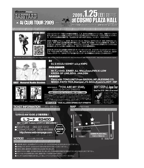 フライヤー完成しました やっとです チケットの購入方法がわからないと問い合わせが多数ありました すいませんでした 下記詳細ですので、お近くの方遠方からでもどうしてもAIに逢いたい方 是非お越しください ホールじゃなくて間近でAIのライブを体験するチャンスです ご不明な点がございましたら、メールでも書き込みでもお尋ねください NTT docomo presents BASSTARD! × AI CLUB TOUR 2009 supported by BLADELIS 【日時】2009年1月25日 【会場】COSMO
