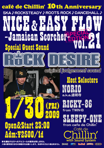 cafe de Chillin' 10th Anniversary Special -Part.1- ◆NICE & EASY FLOW◆21 Jamaican Scorcher Special Edition 【Special Guest Sound】 ROCK DESIRE [Selector] NORIO(from道明寺) RICKY-86 (from Twin-B) SLEEPY ONE(from Chillin) 1/30(金) cafe de Chillin'@水戸 START/23:00 Adm: ¥2500/1D(当日のみ)