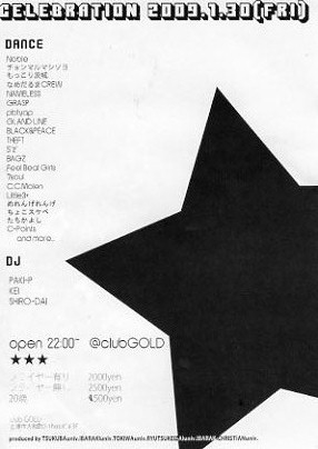 〜HIPHOP〜 22:00 OPEN 2009年 成人式EVENT! -GUEST DANCE- ・DOGG RACE -DANCE- 茨城大学 BAGUZ/Feel Beat Girls 7soul/3DAlism☆ キリスト大学 Noble/なめだるまCrew チョンマルマシソヨ もっこり茨城 流経大学 NAME LESS/GRASP 常磐大 PbT☆yap/GLAND LINE BLACK&PEACE/THEFT/5"Z" 筑波大学 C.C.Molen/Little3+ Marco7/めれんげれんげ ちょこスケベ/C-Point たちかよし DJ.PAKI-P/DJ.KEI DJ.SHIRO-DAI produced by REAL JAM DAY \2500/1D W/F \2000/1D 2009年度成人式を迎える方は\500/1D