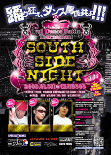 告知失礼します、 不適切であれば削除お願い致します。 宮崎ダンスシーンに新たな歴史を刻んだVol.3より半年・・・ Vol.4・・・・開催!! 『上手いヤツが勝つんじゃない、勝ったヤツが強いんだ!』 毎回300名超の観客と 60名以上のバトラーで大興奮のダンスバトル!! 今回のバトルを制するものはだれか・・・ 今回のテーマは九州 九州を代表するバトラーがジャッジ! South Side Night Vol.4 =1vs1Dance Battle Tournament= [HIPHOP/RB/FUNK/SOUL] ◆日時◆ 2009/1/31[Sat]