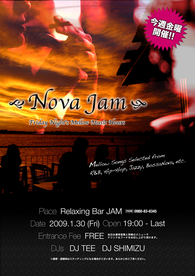 Relaxing Bar JAM Presents "Nova Jam" Friday Night's Mellow Music Hours 2009.1.30(金) Open 19:00 - LAST エントランス無料! ※通常営業と同様のメニューでドリンク&フードをお召し上がり頂けます。