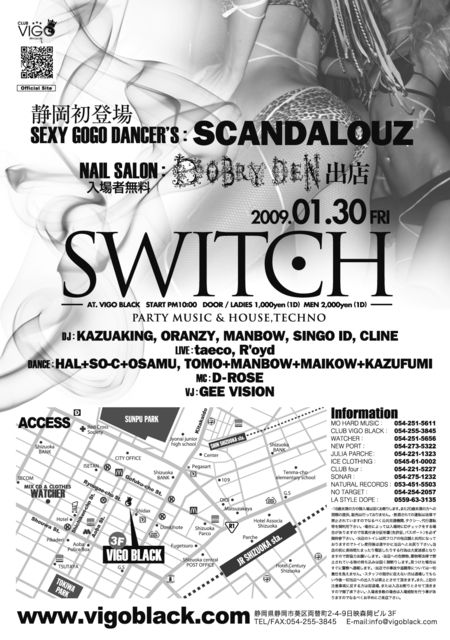 SWITCH (PARTY MUSIC & HOUSE,TECHNO) ADM : MEN \2,000 (1D) / LADIES \1,000 (1D) 静岡発登場!!SEXY GOGO DANCER'S / SCANDALOUZ ネイルサロン / DOBRY DEN出店!(入場者無料) DJ / KAZUAKING, ORANZY, MANBOW, SINGO ID, CLINE LIVE / KYOKO.XX, R'oyd DANCE / HAL+SO-C+OSAMU, TOMO+MANBOW, MAIKOW+KAZUFUMI MC / D-ROSE VJ / GEE VISION