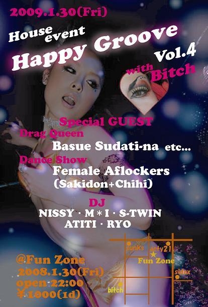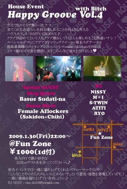 カキコミ失礼いたします!! ついに第4弾となりましたっ HAPPY GROOVE♪ 今回はスペシャルゲストに、アゲアゲドラァグクイーンのバスエスダチーナ(ビッチのママ)&徳島最高峰のロッキンダンスユニット・Female Aflockers(さきどん+ちひ)を迎え、より一層HOTな夜を提供しまっす ディープな徳島の夜を体験しに来ませんか?? みんなで楽しんじゃいましょー HOUSE EVENT‘HAPPY GROOVE Vol.4’ 2009.1.30(金) 22:00〜 @FUN ZONE (場所は添付の右下アップしてくださいっ) Door:¥1000(1D