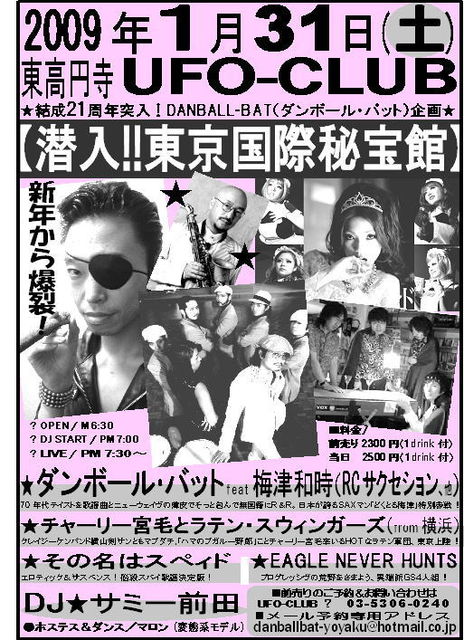 結成21周年突破!横山剣(CRAZY KEN BAND)、常盤響、湯浅学ら著名諸氏にも隠れファンを持ち、インディース時代の「ゆら帝」とはレーベルメイト。70年代テイストをネタにストレンジでラグジュアリーな無国籍ROCKを提唱する永遠のB級バンド【ダンボール・バット】が新春に贈る、爆裂な一夜にアナタも是非!古くはRCサクセションのサポート等でもおなじみ名SAXプレイヤー梅津和時氏ほか