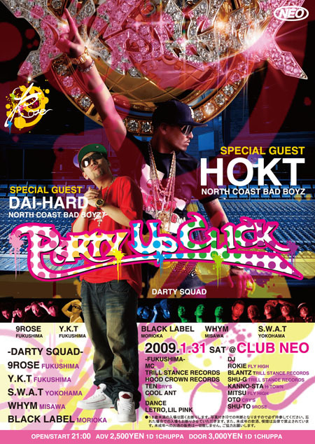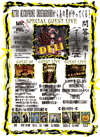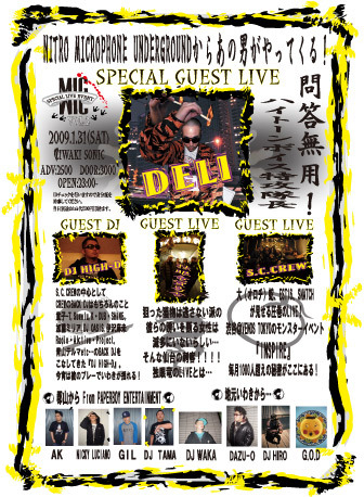 M.I.C special live event 2009.1.31(sat) @SONIC(いわき) ADV \2500 DAY \3000 当日別途drink代\500 OPEN 23:00 SPECIAL GUEST LIVE DELI GUEST LIVE 独眼竜貿易舎(SENDAI) S.C.CREW(TOKYO) GUEST DJ DJ HIGH-D(TOKYO) DJ DJ TAMA(KORIYAMA) (PAPERBOY ENTERTAINMENT) DJ HIRO DJ WAKA LIVE AK NICKY LUCIANO GIL (KORIYAMA) (PAPERBOY ENTERTAINMENT) DAZU-O G.O.D