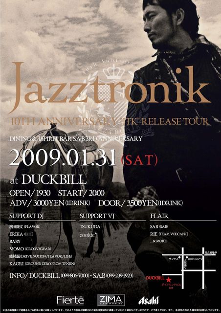 来る2009.1.31(土)にS.A.Bの3周年イベントをする事が決まりました〜 スペシャルゲストに活動10周年を記念し『小泉今日子』『武田真治』『JUJU』など、豪華アーティストを迎えたアルバム「JTK」をリリースした『Jazztronik』 アルバムのリリースツアーも兼ねていて、ライブはなんと鹿児島初 絶対に見逃すべからず PROFILE:Jazztronik Jazztronikとは野崎良太が率いる特定のメンバーを持たない自由なミュージック・プロジェクト 2003年6月徳間ジャパン・コミュニケーシ