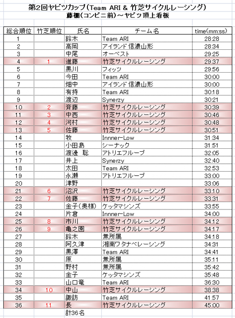 第二回 竹芝カップ ヤビツヒルクライム大会 を開催します〜。 ◎2009年2月21日(土) 朝9時くらい@名古木交差点 一番速くヤビツのテッペンまで登るのは いったいどいつだい? すごい速い人を集めて、ますら王の記録を破るのが 目標です。 皆さん、ふるって参加下さい!! --------------------------------------- 皆様大変お疲れ様でした。 次回は自分も参加できたら楽しそうだなぁと 思いました。 自転車はいいですね! 表紙にもリザルト反映させておきます。 ---------------------------------