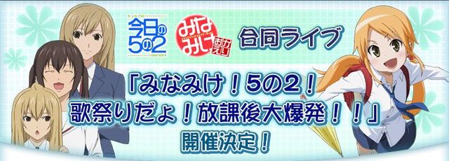みなみけ!5の2!歌祭りだょ!放課後大爆発!!(http://www.starchild.co.jp/event/live_0201.html) 日時:2009年2月1日(日) 開場16:00/開演17:00/終演20:00(予定) 会場:横浜BLITZ(http://www.tbs.co.jp/blitz/y_map.html) イベント内容:コンサート 出演者:「今日の5の2」より Friends・・・小林ゆう(佐藤リョータ)、下田麻美(小泉チカ)、MAKO(相原カズミ)、明坂聡美(浅野ユウキ)、阿澄佳奈(平川ナツミ)、本多陽子(日高メグミ) 「みなみけ おかえり」より 佐藤利奈(南春香)、井上麻里奈(南夏奈)、茅原実