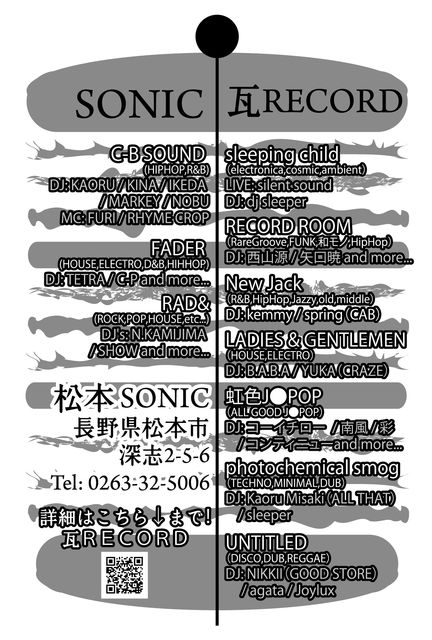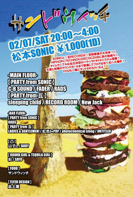 松本市内の二つの音楽スポット、SONICと!瓦RECORDが!空前絶後の大合体!! HIPHOPにTECHNOにDISCOにDUBに…その他諸々ごちゃまぜナイト。 なんと、タイムテーブルは当日決定ー。 ハラハラドキドキダンスフロアになること間違いなし。右に左に大騒ぎ! 挟まれて生まれる新しい味をぜひとも体験してってくださーーーい!!! ◆◆◆サンドウィッチ◆◆◆ 【DATE】 02/07(SAT) 20:00〜4:00 【PLACE】 松本SONIC 【参加費】 ¥1,000(1D) -MAIN FLOOR- 【PARTY from SONIC】 C-B SOUND / FADER / RAD$ 【PARTY from 瓦】 sleeping