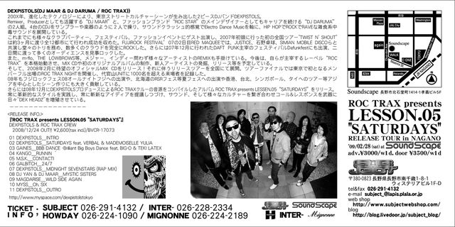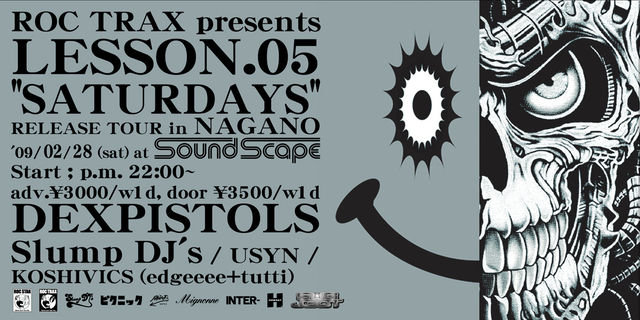 告知失礼致します。 ROC TRAX PRESENTS LESSON.05 "SATURDAYS" RELEASE TOUR in NAGANO '09/02/28(sat) at Sound Scape START ; p.m. 22:00〜 adv.¥3000/w1d, door ¥3500/w1d DEXPISTOLS Slump DJ's / USYN / KOSHIVICS(edgeeee + tutti) TICKET INFO SUBJECT 026-291-4132 HOWDAY 026-224-1090 INTER- 026-228-2334 MIGNONNE 026-224-2189
