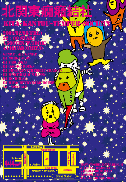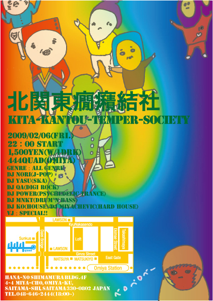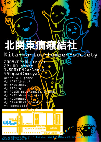 我等が兄貴DJmnktオーガナイズイベントを開催します。 【北関東癇癪結社Vol.1】 2009.2.6(Fri)22:00−/大宮 Club 444quad \1,500-(w/1drk) DJs ・DJ NORI(J-POP)/22:00-22:45 ・DJ YASU(Ska)/22:45-23:30 ・DJ Q.A(DigiRock)/23:30-0:50 ・DJ POWER(Psychedelic Trance)/0:50-1:50 ・DJ MNKT(Drum 'n Bass)/1:50-2:50 ・DJ KO(House)/2:50-3:50 ・DJ MIYACHEVIC(Hard House)/3:50-4:50 VJs ・PARUKO(a.k.a栗原), LUMPE(a.k.aともちん), 芋餡(a.k.aぴめ子)の強烈な3人 Acces