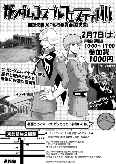 スペースお借りいたします。 今回このイベントの企画などに関わらせて頂き、先方の許可も得たのでこの場で宣伝させて頂きます。 イベント当日は色々な企画やあんなセットやそんな!?セットを用意できるよう随意製作中です!! お楽しみに! 注:画像は開発中のものです。 ■イベント内容■ 全てのガンダム作品オンリーコスプレイベント ■運営■ JCF-ジャパンコスプレフェスティバル ■開催日時■ 2009年2月7日土曜日10:00-17:00 ■会場■ コミュニティセンター進修館 ■参加費■ 1000円 ◆
