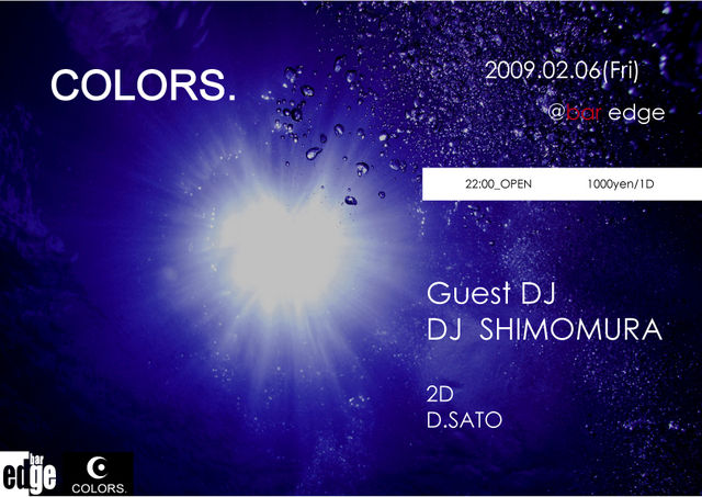 告知失礼いたします。 edge、第1金曜のCOLORSです。 今回はゲストにDJ SHIMOMURAを迎えます。 よろしくお願いします♪ http://www.d-colors.jp ☆ COLORS ☆ 2/6 (FRI) @edge 22:00 start 1000yen (1D) ★ guest dj ★ DJ SHIMOMURA ★ music by ★ 2D (COLORS./Optimo) d.sato (COLORS./Optimo)