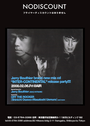 2007年にフランスの絶好調レーベル「kitsune」からリリースされたMIX CD「BOOMBOX」を世界的にヒットさせたことも記憶に新しいDJ,Jerry Bouthierが新たなMIX CD「INTER-CONTINENTAL」のリリースに合わせて、遂に再来日決定!!!日本からは、今回のMIX CDに収録される大沢伸一が上村真俊との DJユニット「OFF THE ROCKER」として参戦!!!世界最新モードの音楽がここに集