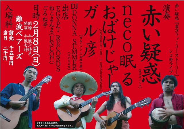管理人様いつもお世話になってます。コミュニティの皆様こんにちは。告知させて頂きます。 昨年10月に発売した、赤い疑惑待望のNEW ALBUM『東京ファミリーストーリー』のレコ発を大阪でやります!! 赤い疑惑、約2年ぶりの来阪!!そしてneco眠る、おばけじゃー、ガル彦といった豪華かつレアな3組が、レコ発を祝して最高のライブを魅せてくれます!! なお、エジプトレコーズで赤い疑惑のCDを購入のお客様には、特典としてポスターが付きます!!こちらも合わせて宜しくお願いしますー!!! *・゜゚・*:.。..。.:*・゜゚・*:.。..。.:*・゜