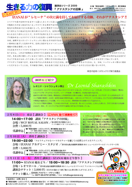 * 突然の書き込み失礼致します。私國友悠一朗といいます。食に直接ではないですが、非常にリンクしたスピリチュアルなイベントのお知らせです。私はダンサーです。IZANAIという踊りで願い、祈りの力を復興する祭を日本全国で27年前から興し続けています。踊りや、歌、アートは平和の道具、祈りの手段、神様と繋がるギフトです。是非ご紹介したい情報があります。それはアナスタシアの回帰といいものです。興味がありましたらyu@suga-izanai.orgまでよろしくお願い致します。 いつもこころに太陽を 國友悠一朗 生きる力