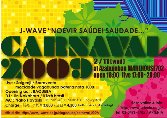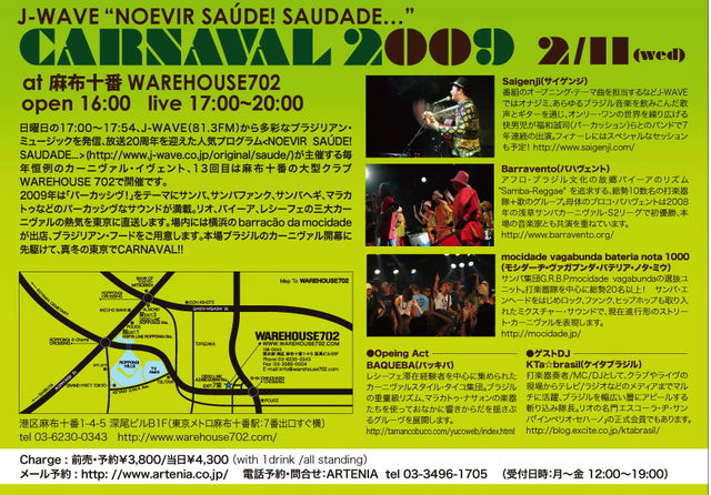 J-WAVE [NOEVIR SAUDE! SAUDADEが主催する毎年恒例のカーニヴァル・イヴェント。13回目を迎える2009年は、麻布十番の大型クラブWAREHOUSE 702で開催!「パーカッシヴ!」をテーマに、ブラジルの三大カーニヴァル・エリア(リオ、バイーア、レシーフェ)のパーカッション・サウンドを網羅、4組のライヴをお届けします。 ★J-WAVE [NOEVIR SAUDE! SAUDADE...] CARNAVAL2009 http://www.j-wave.co.jp/blog/saude/carnaval_2009/ ●日時:2009年2月11日(水・祝) Open 16:00 Live 17:00〜20:00 ●会場:麻布十番 WAREHOUSE702 ●LIVE:S