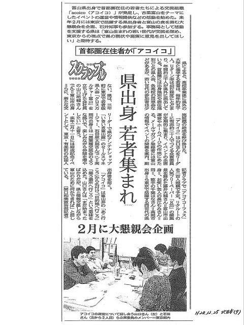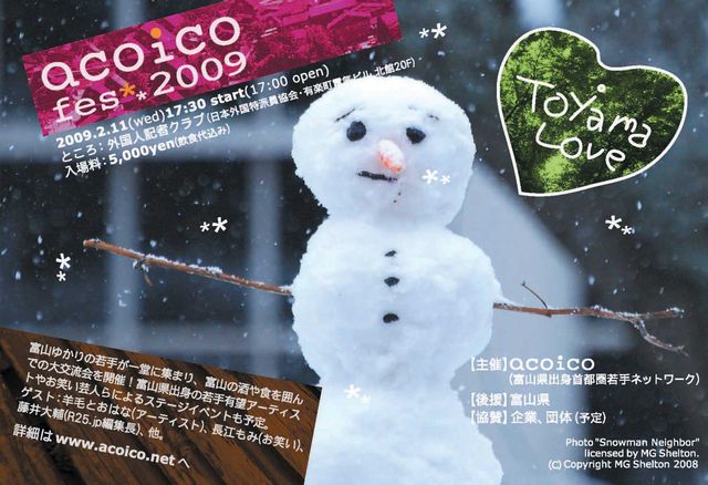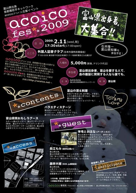 私は、有楽町にある富山県のアンテナショップのスタッフもしている者ですが、副管理人ヒーロさんにもご相談し、この場を借りて告知させていただきます。 このたび、県の応援も頂き、首都圏在住の富山ゆかりの若手を中心とした新たなネットワーク「acoico」(アコイコ)を立ち上げることになりました http://acoico.net ※acoicoとは、”富山弁であそこ行こ!”の意味 これまで有志でミニイベントも開催してきたのですが、2009年2月11日(水、祝)に有楽町にて、初のビックイベント"acoico fes 2009"を開催することになりまし
