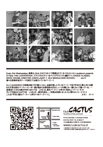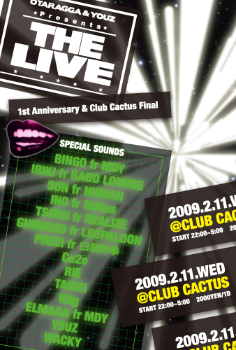 管理人様、 告知失礼します。 2009/02/11(wed) 「THE LIVE」 ~『1st Anniversary』~ ♪HIP HOP.DANCE CLASSIC.SOUL.FUNK.ROCK.HOUSE.ERECTRO.DISCO♪ (OLD MIDDLE,NEW SCHOOL・・・etc!!!) -SPECIAL MUSIC DJ'S- ■BINGO fr MDY ■IRIKI fr LADD LOUNGE ■SON fr NUBIAN ■INO fr Stayllas ■TSURU fr REALIZE ■GUNHEAD fr LEOPALDON ■PREZI fr 白鬚酔拳 ■k8g fr 51nation(ex.ollie mag) ■DJ RIE ■YOUZ ■ca2o ■TAISEI ■ELMAAA fr MDY ■WACKY -START-22:00〜5:00 -ADM-