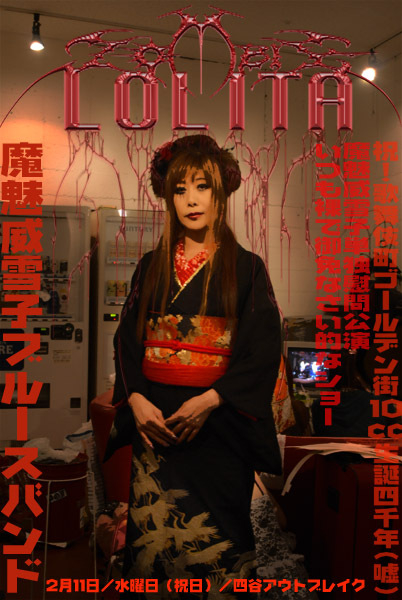 2月11日/水曜日(祝日)/四谷アウトブレイク http://www.hor-outbreak.com/index.html 魔魅威雪子ブルースバンド 四谷駐屯地壮絶単独慰問公演 * マミ−由起子 (黒薔薇帝国) 凛怜(THE RING LEY) ジミ−竹村(黒薔薇帝国) 鬼殺 (黒薔薇帝国) ウエケン(中出し少年) 小林(ゾンロリ専務) チャナ(ゾンロリ団長) * VIDEO/K・すなはら (羊の皮をかぶったヤギ)& K・工藤(39°) *