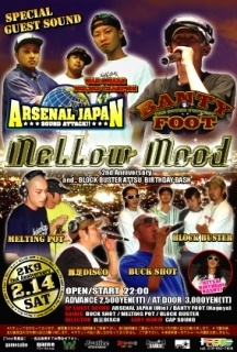 >【MELLOW MOOD】~SPECIAL~ >~2nd ANNIVERSARY&BLOCK BUSTERアッツBIRTHDAY BASH!!~ > >2/14(SAT) @FACES >OPEN/22:00~TILL MORNING >前\2500(1T)/当\3000(1T) > >-SP GUEST SOUND- >ARSENAL JAPAN(三重) >BANTY FOOT(愛知) > >-SOUND- >BUCK SHOT >MELTING POT >-HOST SOUND- >豚足DISCO/BLOCK BUSTER >-EARY WARM- >CAP SOUND >-物販- >GAMEclothing & MIX CD > >※今回のメロウムードは祝2周年のスペシャルダンス!!そして今年もやります!!BLOCK BUSTERアッツのBIRTHDAY BUSH!!そんな日に祝い駆け付けてくれるのは東海…いや日