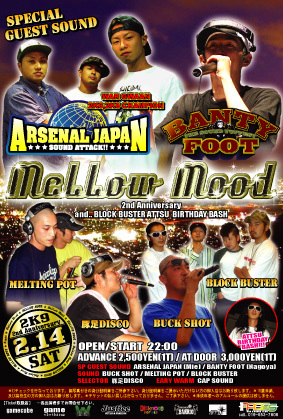 【MELLOW MOOD】〜SPECIAL〜 〜2nd ANNIVERSARY&BLOCK BUSTERアッツBIRTHDAY BASH!!〜 2/14(SAT) @FACES OPEN/22:00~TILL MORNING 前\2500(1T)/当\3000(1T) -SP GUEST SOUND- ARSENAL JAPAN(三重) BANTY FOOT(愛知) -SOUND- BUCK SHOT MELTING POT -HOST SOUND- 豚足DISCO/BLOCK BUSTER -EARY WARM- CAP SOUND -物販- GAMEclothing & MIX CD ※今回のメロウムードは祝2周年のスペシャルダンス!!そして今年もやります!!BLOCK BUSTERアッツのBIRTHDAY BUSH!!そんな日に祝い駆け付けてくれるのは東海…いや日本を代表する